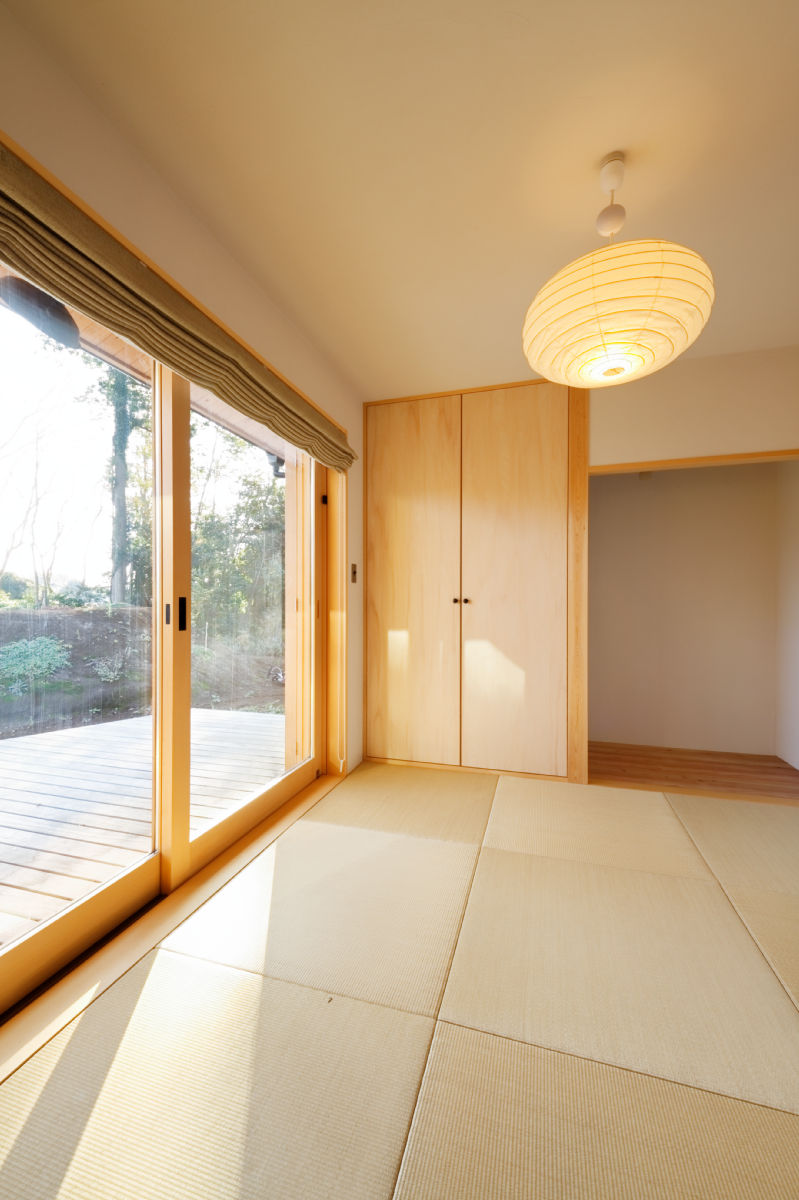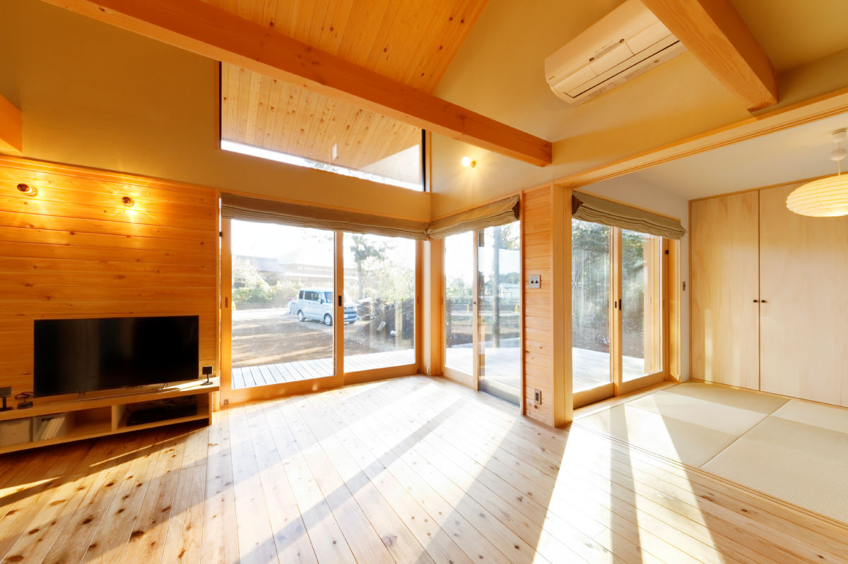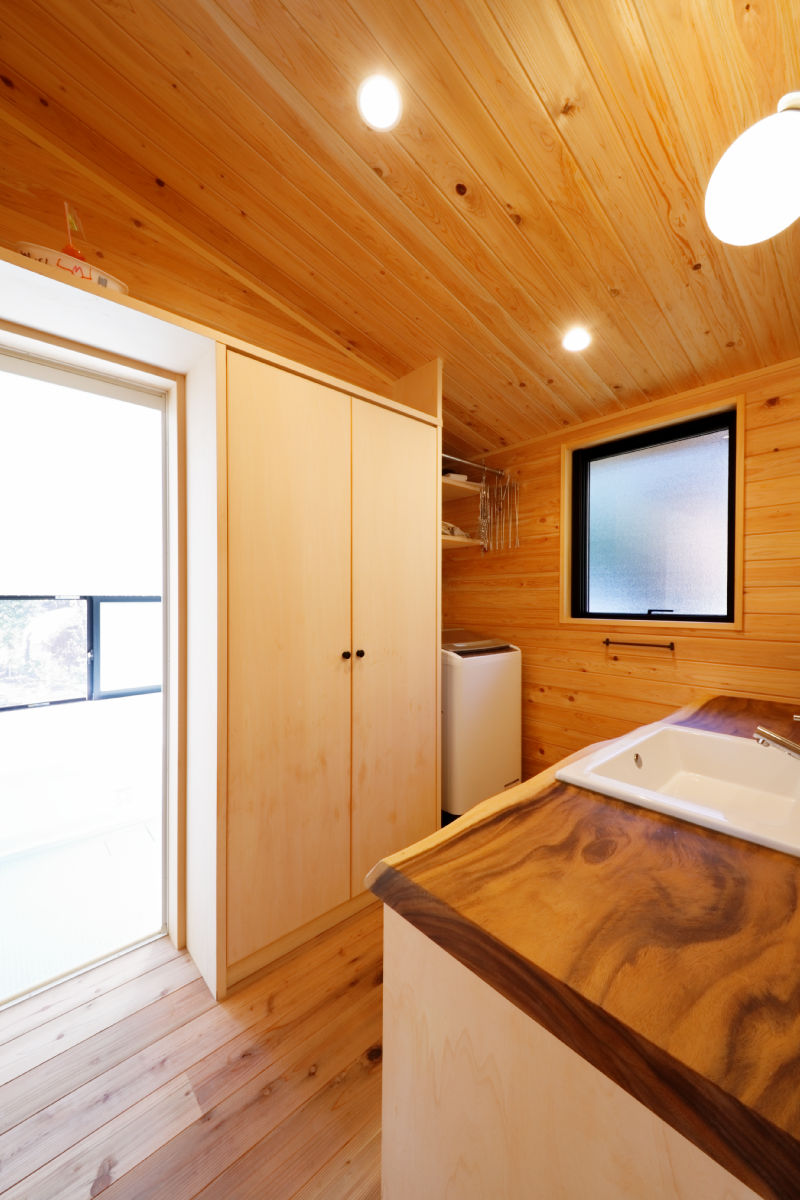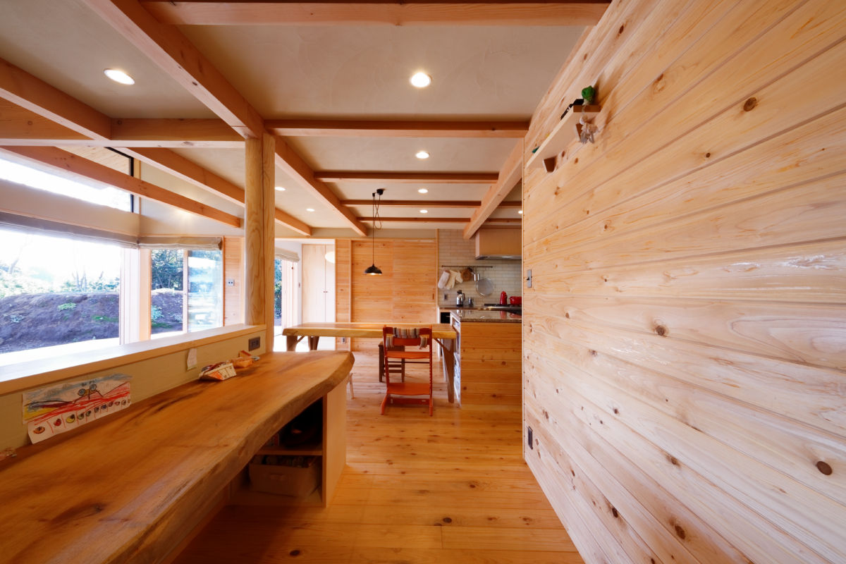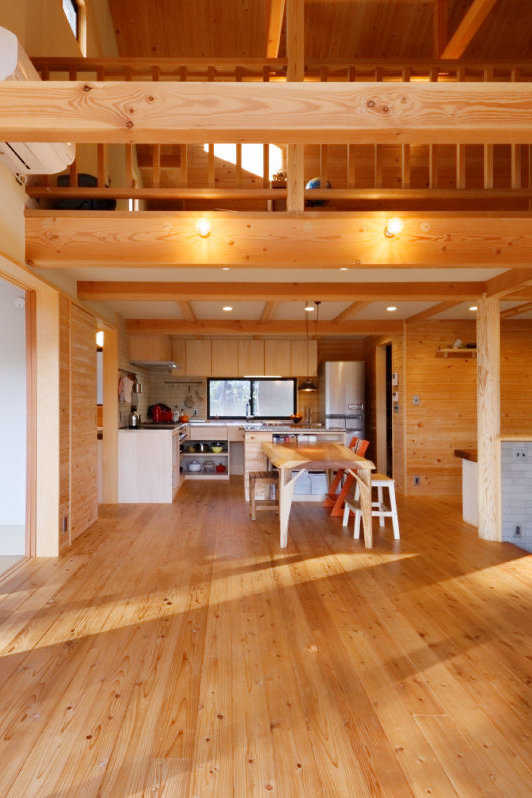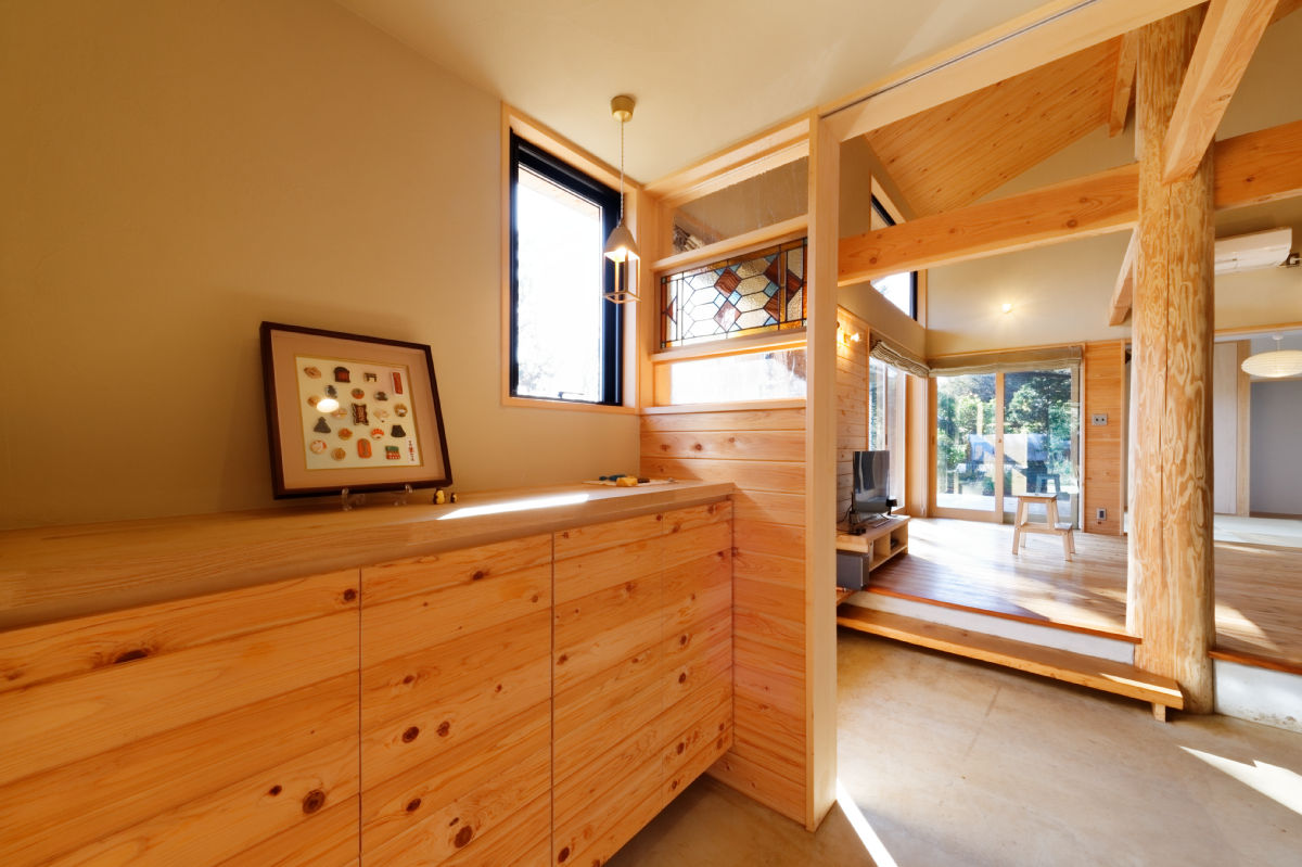 | 仕上材 | 外壁/ジョリパッドゆず肌仕上げ、杉板鎧張り 内壁/中霧島壁、サワラ羽目板、タイル 床/無垢フローリング(杉) 土間/モルタル金こて仕上げ 天井/中霧島壁、サワラ羽目板 ウッドデッキ/クマル 屋根/ガルバリウム鋼板 |
