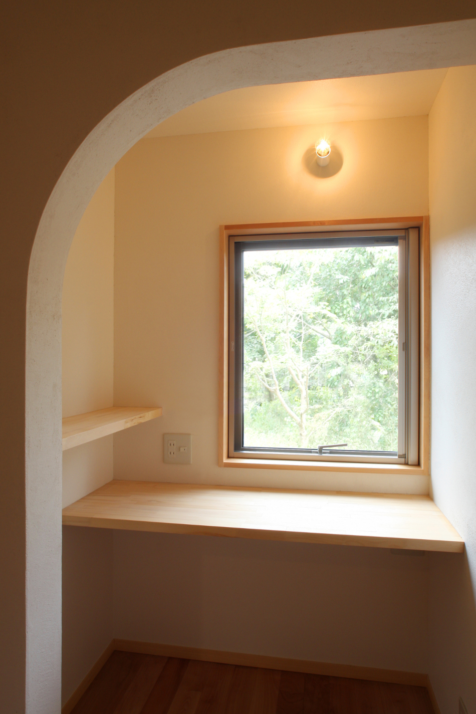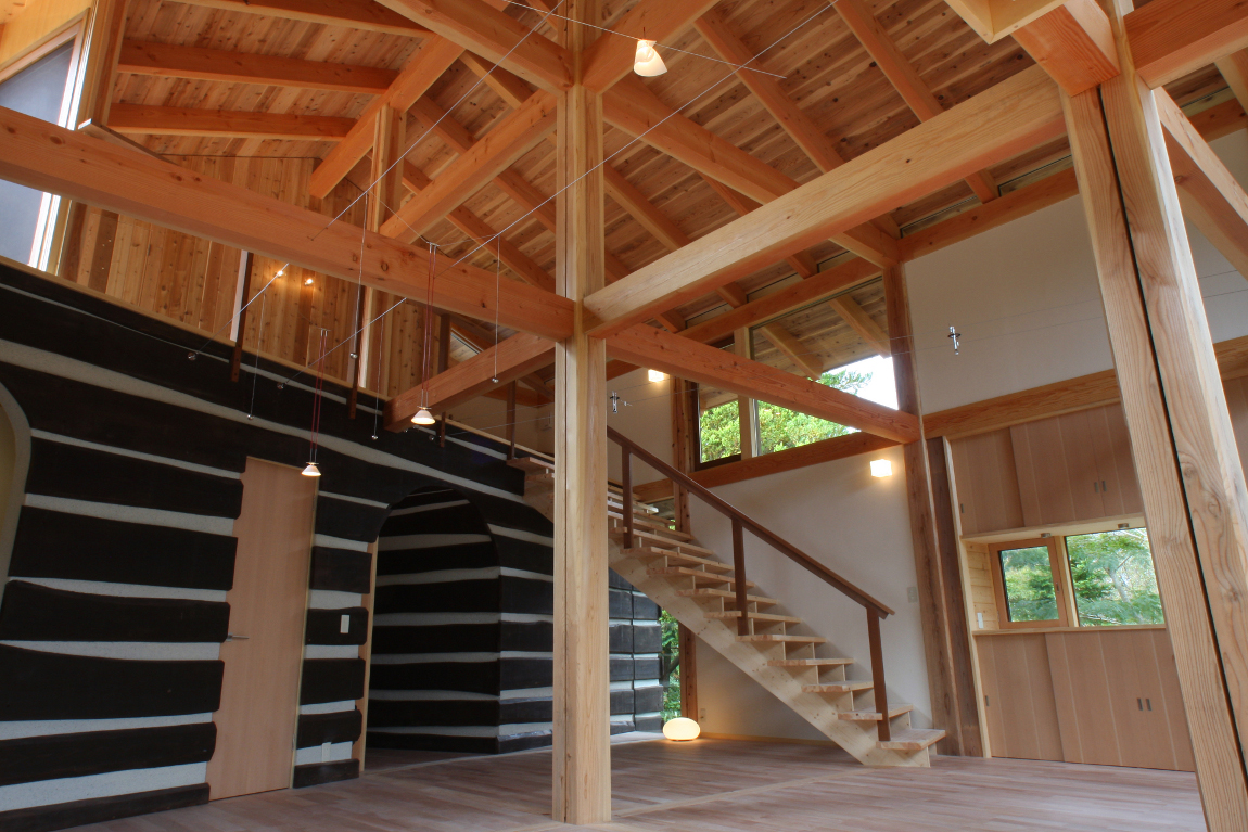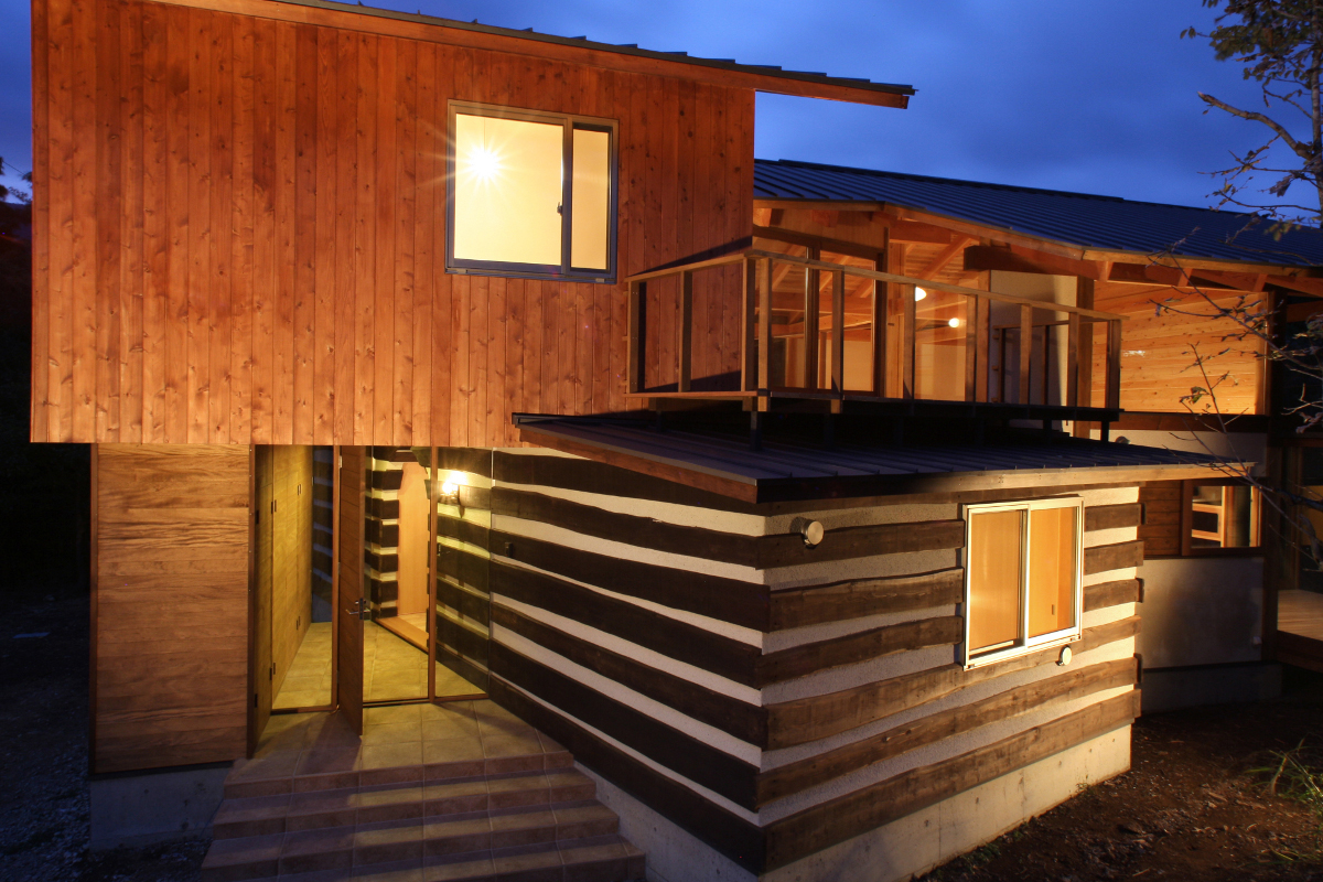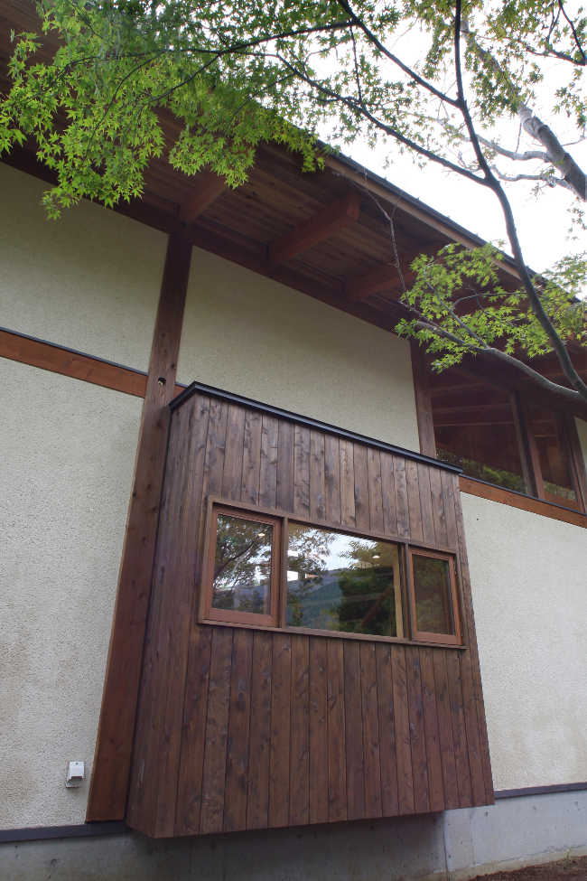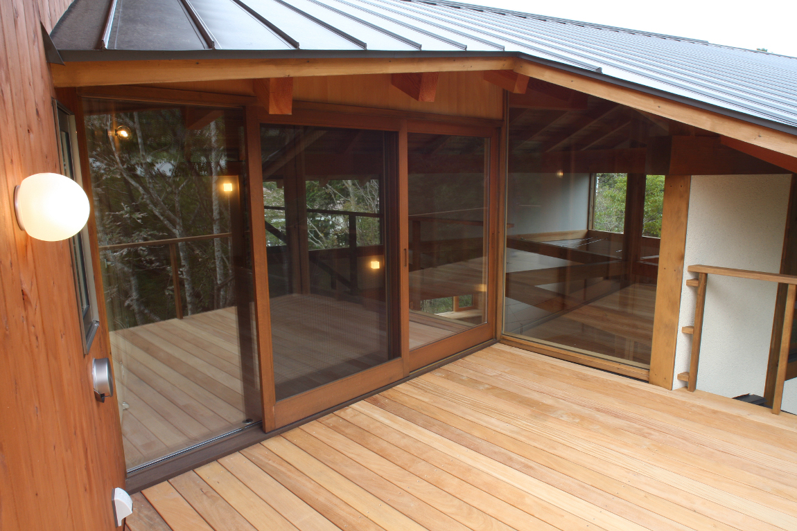| 仕上材 | 外壁/そとん壁、レッドシーダー羽目板、杉&漆喰チンキング 内壁/エコクイーン、レッドシーダー羽目板、サワラ羽目板、杉&漆喰チンキング 床/無垢フローリング(桜) 天井/無垢羽目板(杉) バルコニー手摺/イエローシーダー ウッドデッキ/グラピア 屋根/ガルバリウム |